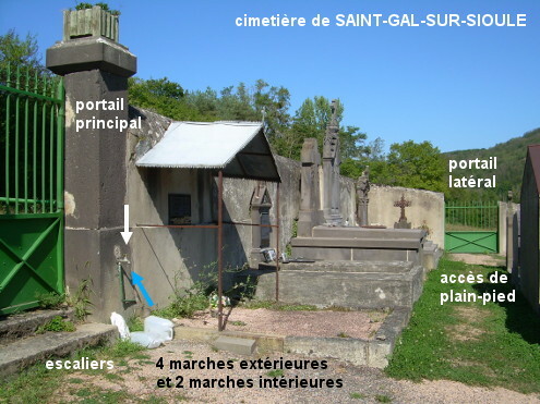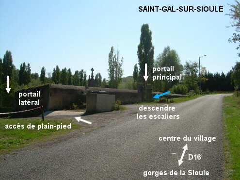 Le cimetière est implanté côté gauche à l'entrée du village (60 mètres après le panneau) sur la D16 lorsque l'on vient de la D915 dans les gorges de la Sioule (et 110 mètres avant le carrefour avec la D15). On trouvera le robinet à l'intérieur du cimetière, à gauche du portail principal donnant sur la route. Pour cela, il faudra d'abord descendre quatre marches d'escaliers puis encore deux marches après ce portail. Sinon, pour un accès de plain-pied, on peut entrer par le portail latéral sur le mur perpendiculaire que l'on voit face à soi quand on arrive vers le cimetière (N.B. : À l'intérieur, l'allée pour rejoindre le portail principal n'est pas en gravillons dans lesquels on s'enfoncerait).