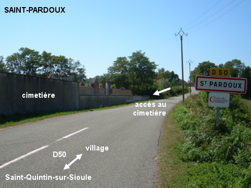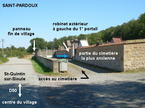 Le cimetière est implanté côté gauche à l'entrée du village (au niveau du panneau) sur la D50 en provenance de Saint-Quintin-sur-Sioule. Le robinet est à l'extérieur, à la gauche du premier portail auquel on accède par l'allée gravillonnée bordée d'un muret située devant le cimetière (dans ce sens, il faut donc dépasser le cimetière pour prendre à 180° l'allée parallèle à la route qui revient vers les deux portails). P.S. : Pour trouver la suite de la D50 en direction de Blot-l'Église, au carrefour dans le village avec la D2144 (route à très grande circulation), prendre à droite un tronçon de D2144 avant de tourner à gauche 160 mètres plus loin.