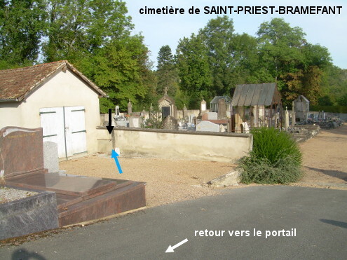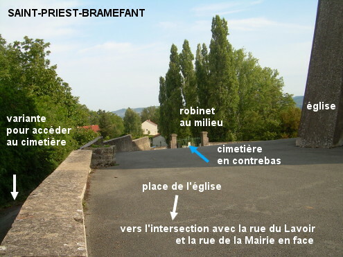 Le cimetière est implanté en face de l'église au bout d'un cul-de-sac (on le voit depuis la D433 direction Randan, mais il n'y a pas de robinet de ce côté-ci). 1) En provenance de Hauterive sur la D131 qui devient D55, un long moment après le début du village tourner à droite en direction de Randan dans la D433. Dépasser l'angle du cimetière situé près de la route, beaucoup plus loin tourner à gauche (la première rue est barrée) en direction de la Mairie (rue de la Croix). Au carrefour en T où il y a une croix, tourner à gauche (rue de la Mairie), passer à côté de la Mairie située sur la droite, et au carrefour juste après il y a deux variantes pour rejoindre le cimetière. 1a) Continuer en face en montant entre le mur de soutènement de la place surélevée et l'église (excellent macadam) puis redescendre pour se trouver face au portail du cimetière situé en contrebas (à 380 mètres de la D433 par cet itinéraire). Entrer puis avancer de 25 mètres sur l'allée asphaltée qui descend et faire 5 mètres vers la gauche sur des gravillons pour trouver le robinet sur le mur de séparation des deux parties du cimetière, avant le cabanon qui est dans ce coin. 1b) Autrement, continuer tout droit en passant à gauche du mur de soutènement de la place de l'église pour accéder par la gauche au cimetière (chemin plat mais au revêtement en mauvais état). 2) En provenance de Mons sur la D55, si l'on est attentif on verra sur la gauche la flèche indiquant la direction de la Mairie. 2a) Si on a vu la première (après la fin du lieu-dit Le Graveyron), il s'agit de la rue de la Mairie à l'autre bout de laquelle il y a la Mairie, et en continuant tout droit on débouchera devant le cimetière. 2b) Si on n'a vu que la deuxième (au début du lieu-dit Le Ruisseau) en face de la D433 direction Saint-Yorre, c'est la rue du Lavoir qui passe aussi à côté de la Mairie. Plus loin dans cette rue (fin septembre 2023 la fin qui rejoint la D433 direction Randan était barrée en raison d'un risque d'effondrement d'un bâtiment mitoyen), on arrivera au carrefour à proximité de la Mairie (à gauche) et de l'église (à droite). Tourner alors à droite pour monter vers l'église puis redescendre vers le cimetière.