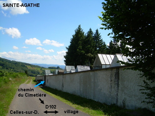 Le cimetière est situé en dehors du village, à 100 mètres de la D102 quand on roule en direction de Celles-sur-Durolle. Le robinet est à l'intérieur du cimetière à gauche du portail (un peu lourd à manœuvrer). 1) À partir du village, prendre la direction de Celles-sur-Durolle sur la D102 puis 160 mètres après le panneau du fin de village, tourner à droite dans le chemin du Cimetière et descendre jusqu'au portail du cimetière implanté côté droit. 2) En provenance de Celles-sur-Durolle sur la D7 puis la D102, observer le paysage côté gauche pour apercevoir les toits pointus des mausolées qui dépassent des murs du cimetière et savoir quand il faudra tourner à gauche dans le chemin du Cimetière.