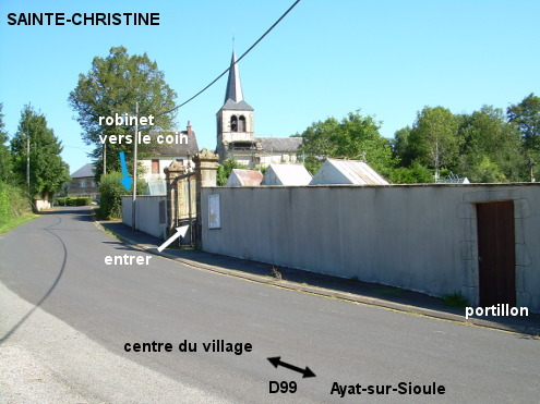 Le cimetière est implanté côté droit à l'entrée du village sur la D99 en provenance d'Ayat-sur-Sioule. Entrer par le portail au milieu du mur et se diriger vers le coin avant gauche (20 mètres d'allée en macadam gravillonné) pour trouver le robinet au-dessus d'un évier sur le mur avant, après le grand mausolée vitré.