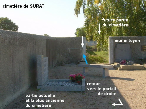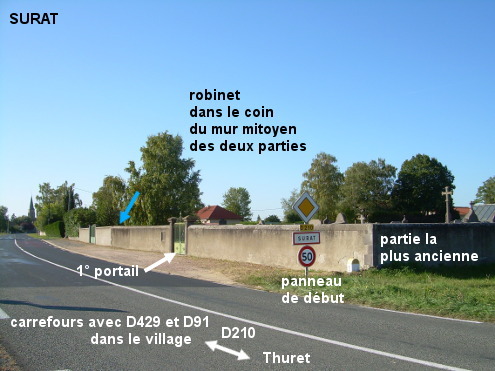 Le cimetière est implanté côté gauche à la sortie du village sur la D210 (route à très grande circulation) en direction de Thuret. En provenance de Saint-Ignat sur la D429 qui rejoint la D91, au carrefour avec la D210 tourner à droite, après 110 mètres la suite de la D429 part à gauche en direction de Martres-sur-Morge, continuer sur la D210, et 390 mètres plus loin on arrivera à hauteur du portail de droite qui donne dans la partie la plus ancienne du cimetière implanté côté gauche juste avant le panneau de fin de village. Entrer et se diriger vers la gauche (allée en terre battue) pour trouver le robinet dans le coin, à côté du passage vers la partie la plus récente.