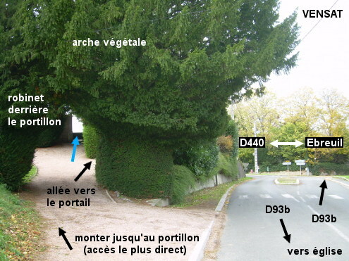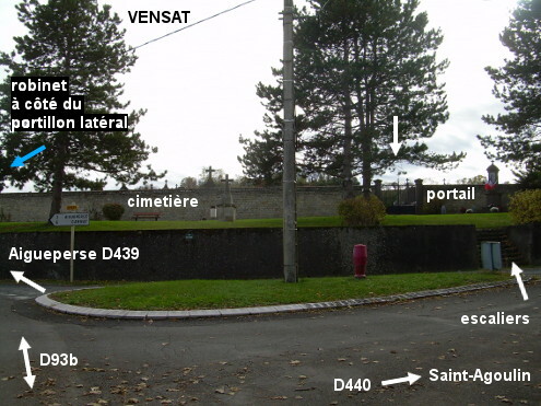Le cimetière est implanté à côté du carrefour D93b / D440, ses deux accès sont piétonniers. Le robinet est à l'intérieur à gauche du portillon latéral. 1) En provenance d'Ebreuil sur la D207 puis la D93 et la D93b, au carrefour à droite avec la D440 venant de Saint-Agoulin, on sera presque en face du cimetière légèrement en surplomb derrière ledit carrefour. On pourrait monter les escaliers et traverser la pelouse pour entrer par le portail puis parcourir 40 mètres d'allée gravillonnée jusqu'au mur de gauche pour trouver le robinet à côté du portillon, mais il y a un accès plus direct. 2) En provenance d'Aigueperse sur la D439, au carrefour en T face à la Mairie, tourner à gauche dans la D93b en direction du cimetière. Peu avant le carrefour en Y avec la D440 dont on aperçoit les panneaux en face, traverser la route pour prendre l'allée piétonne en terre battue de 30 mètres qui débute sous une arche formée par des arbres et des buissons taillés, et qui monte jusqu'au portillon du cimetière. On trouvera la robinet à l'intérieur, immédiatement à gauche.
