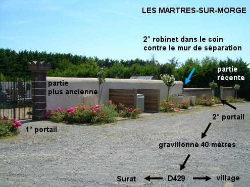 Le cimetière est implanté côté droit juste après le panneau de fin de village sur la D429 direction Surat. Il est composé de deux parties avec chacune un robinet dans son coin avant gauche (à 10 mètres du portail correspondant). Les deux portails donnent sur une allée gravillonnée perpendiculaire à la route (40 mètres jusqu'au portail de droite qui donne dans la partie plus récente). 1) En provenance de Saint-Ignat sur la D17, tourner à droite dans la D29 direction Surat (panneau orienté face à l'autre sens) pour trouver le cimetière côté droit juste après le panneau de fin de village. 2) En provenance de Surat sur la D429, attention : le panneau de début de village est implanté côté gauche au dos de celui qui marque la fin du village. L'allée à gauche qui dessert les deux portails du cimetière (orientés face au sens de circulation opposé) est située juste avant ces panneaux. 3) À partir d'autres provenances, suivre d'abord la direction de Saint-Ignat, puis une fois sur la D17 tourner plus loin à gauche dans la D429 direction Surat.