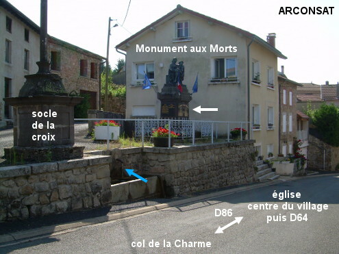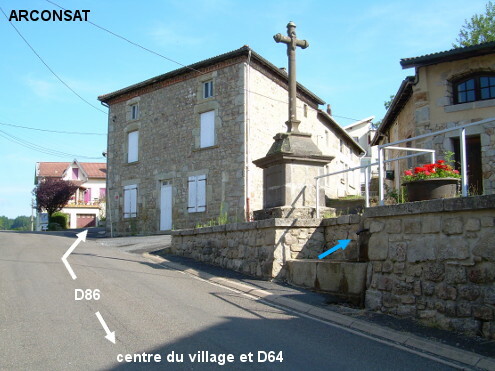 Cette fontaine se trouve à la sortie du village sur la D86 qui monte au col de la Charme, près du Monument aux Morts. En provenance de Palladuc sur la D64 puis la D86 qui monte déjà et vers la fin du village, on découvrira la fontaine côté droit dans un renfoncement du mur, en contrebas d'une petite place triangulaire sur laquelle est érigé le Monument aux Morts, et une grande croix dans la pointe du carrefour avec la rue adjacente conduisant à la Mairie. L'eau de cette fontaine s'écoule avec un débit très important dans un bassin en pierre rectangulaire. AVERTISSEMENT : il n'y a aucun écriteau concernant sa potabilité. P.S. : Vous pouvez continuer jusqu'au cimetière si vous préférez vous servir à un robinet.