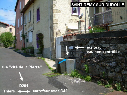 Cette fontaine est située dans une rue secondaire à 100 mètres de la D201 direction Thiers. En provenance de Palladuc sur la D201, au carrefour avec la D42 près de l'église (attention : l'eau de la fontaine sur la place à droite est non potable, l'écriteau est partiellement masqué par les jardinières de fleurs suspendues à sa margelle), tourner à droite dans la suite de la D201 (il n'y a pas de flèche, juste une ancienne plaque Michelin peu visible sur un mur). Plus loin (à 160 mètres) une flèche confirme que l'on est bien en direction de Thiers. Environ 80 mètres après, tourner à droite (il y a une flèche ''maison des associations'', c'est la bâtisse au début de la rue qui a comme plaque de nom de rue : ''cité de la Pierre'') dans la rue qui vire ensuite à gauche et monte. On trouvera la fontaine côté droit juste avant le portail au numéro 26. Elle s'écoule dans un petit bassin rectangulaire en pierre et est surmontée d'un écriteau ''eau non contrôlée''.