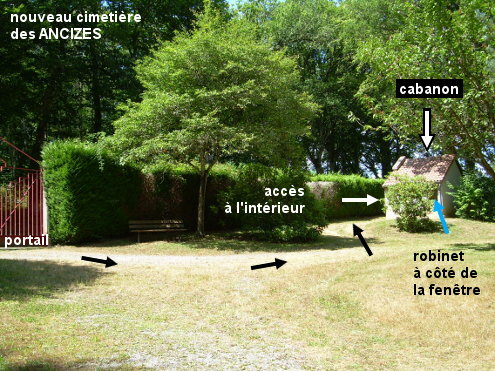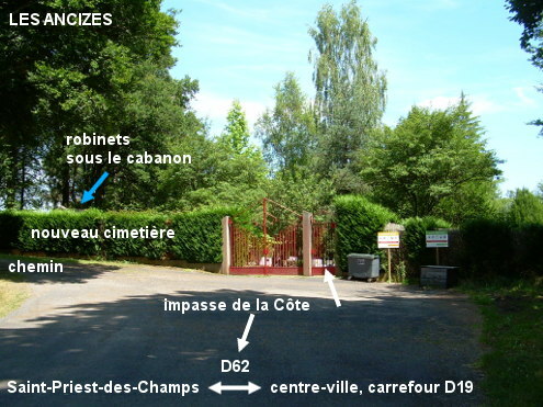 Le nouveau cimetière (fléché) est implanté au fond d'une impasse au nord de la ville, à 370 mètres de la D62 direction Saint-Priest-des-Champs. Il a deux robinets dans un cabanon situé à l'intérieur à 20 mètres sur la gauche. 1) Sur la D62 en provenance de Saint-Priest-des-Champs, 250 mètres après le panneau marquant le début de la ville, tourner à gauche (la flèche ''cimetière'' est orientée pour ceux qui arrivent du centre-ville). Rouler jusqu'au bout de cette rue en cul-de-sac pour arriver face au portail du cimetière entouré de haies arbustives. Entrer par le portillon et se diriger vers la gauche pour trouver le cabanon (qui n'est pas accolé au mur). Entrer dans sa première partie par la gauche (côté en regard de l'enceinte du cimetière) pour trouver les deux robinets au-dessus d'un grand évier. On pouvait même accéder au robinet de droite par l'extérieur par une grande ouverture type fenêtre dans le mur du cabanon. 2) En provenance de Chapdes-Beaufort sur la D62, celle-ci rejoint en T la D19 à laquelle elle se superpose un moment sur la gauche. Tourner à gauche en direction du centre-ville puis au carrefour avec la D61 et la D62, tourner à droite dans la D62 direction Saint-Priest-des-Champs. Plus loin, après le rond-point tourner dans la première à droite en suivant la flèche ''cimetière'' pour trouver celui-ci au bout de l'impasse.