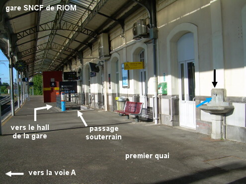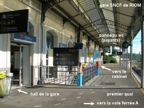 Le robinet se trouve sur le premier quai de la gare SNCF (fléchée). Il est situé sur la gauche à 20 mètres à peine de la porte du hall de la gare qui donne sur le premier quai (longeant la voie A), il est installé au-dessus d'un réceptacle en pierre contre le bâtiment de la gare. P.S. : Il y a des toilettes plus loin sur la gauche mais leur accès est payant.