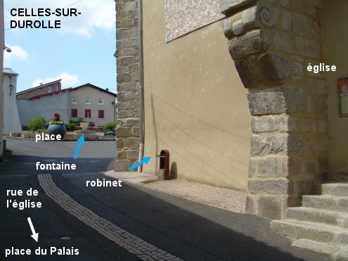 Le robinet et cette fontaine se trouvent à côté de l'église qui est érigée près de la rue principale qui traverse le bourg du nord au sud et qui est en retrait derrière une autre fontaine, décorative (à l'eau non potable). En provenance du lieu-dit Le Pont-de-Celles sur la D7, au rond-point tourner à droite en direction du centre bourg. Un peu plus loin tourner à droite après l'église dont on voit l'arrière (rue de l'église). On trouvera d'abord (à 45 mètres) le robinet sur un support côté droit près de la fin du mur de l'église, puis (à 70 mètres) la fontaine au début de la place (qui a manifestement été récemment rénovée) qui fait face à une entrée de l'église côté opposé à la rue principale. La fontaine s'écoule dans un bassin en pierre. AVERTISSEMENT : Elle n'est accompagnée d'aucun écriteau se rapportant à la potabilité de son eau. Toutefois, on peut penser qu'elle est seulement non surveillée, étant donné que trois autres fontaines dans le village sont quant à elles bien signalées comme non potables.