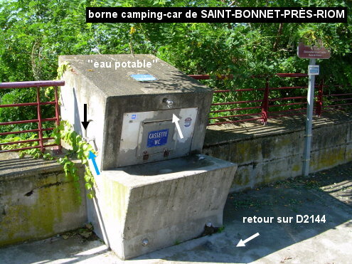 L'aire-service pour camping-car se trouve sur la place sise à côté de l'église au bord de la D2144. En provenance de Châtel-Guyon sur la D985, aux feux tricolores tourner à droite dans la D2144 (direction Riom, à très grande circulation). Juste après l'église, entrer à droite sur le parking en suivant le pictogramme fléché de l'aire pour camping-car. Le bloc en ciment sur lequel sont fixés les deux robinets se trouve sur la gauche au début du parking après le point tri. Sur sa face supérieure il y a un écriteau ''eau potable''. N.B. : Il est peut-être préférable d'utiliser le robinet fixé sur le côté gauche du bloc ciment, même si son jet part en biais et que l'on risque ainsi d'être mouillé, parce que le robinet qui est sur le devant pourrait avoir été souillé par des éclaboussures lors de la vidange des cassettes wc des camping-car dans la trappe sous celui-ci. P.S.1 : Les toilettes indiquées sur le panneau à côté de celui pour l'aire camping-car, ne se trouvent pas sur ce parking mais quelques mètres après sur la D2144, juste derrière la rue adjacente (elles n'étaient toutefois pas en service fin juillet 2024). P.S.2 : Itinéraire recommandé pour la suite : continuer quelques mètres sur la D2144 pour prendre à gauche la D421 direction Le Cheix-sur-Morge (il faudra ensuite emprunter 290 mètres de D2009 à très grande circulation en faisant gauche / droite pour trouver la suite de la D421 et entrer dans Pessat-Villeneuve).