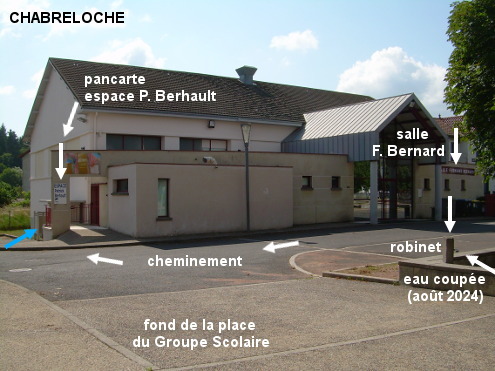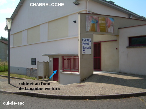 Ces toilettes se trouvent à gauche de la salle Fernand Bernard (fléchée) dans un recoin au fond d'une grande place, à 220 mètres de la D2089 (près de son carrefour avec la D324). Sur la D86 en provenance d'Arconsat, au stop avec la D324 tourner à droite pour déboucher aussitôt sur le carrefour en T avec la D2089. À ce deuxième stop tourner à gauche puis presque aussitôt à droite (rue du Groupe Scolaire, en sens unique), attention : la flèche indiquant la salle F. Bernard est orientée face à l'autre sens. À la fin du tronçon en sens unique, continuer tout droit jusqu'au bout de la grande place située côté gauche puis entrer à gauche sur cette place en suivant les flèches de la salle Fernand Bernard et de l'espace Patrick Berhault. Continuer au-delà de cette salle implantée à droite, jusqu'à l'espace Patrick Berhault dont on verra la pancarte dans le recoin au fond à droite. Les toilettes sont juste après sur le côté droit. Il s'agit de vieilles toilettes de type vespasienne. On trouvera un robinet-vanne (attention : l'eau gicle) sur le mur du fond de la cabine WC turc. P.S. : Pour repartir, faire demi-tour puis face au sens interdit prendre la rue à gauche qui débouche sur la D2089 (sur la droite on pourra retourner vers la D324).