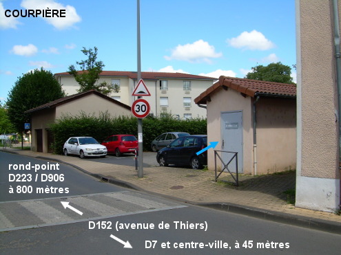 Ces toilettes se trouvent au bord d'un petit parking à la périphérie du centre-ville, au début de la partie de la D152 qui rejoint la D906 en direction de Thiers. 1) En provenance de Sermentizon sur la D152, qui peu avant la ville rejoint la D7 venant à droite de Trézioux, au carrefour en T (face à une ruelle) avec la D58 venant à droite de Saint-Dier-d'Auvergne tourner à gauche dans la suite de la D7 (superposée à la D152). Peu après on longe une place tout en longueur sise côté gauche, tourner à gauche juste derrière dans la D152 (direction Thiers). Le petit bâtiment des toilettes est implanté au bord d'un parking 45 mètres plus loin côté droit, en face d'un passage piéton surélevé. 2) En provenance de Vollore-Ville sur la D7, rejointe par la D58 venant d'Escoutoux, continuer tout droit puis au carrefour en T prendre à droite en ville un bout de D906 (route à très grande circulation), puis aux feux tourner à gauche dans la suite de la D7. On arrive plus loin en vue de la grande place, sise côté droit, tourner à droite juste avant en suivant la flèche ''cimetière'' (D152 direction Thiers) pour trouver les toilettes un peu plus loin. 3) En provenance de Lezoux sur la D223, au rond-point avec la D906, tourner à droite dans la D152 en direction du centre-ville et rouler presque jusqu'à la fin de cette rue (sur 800 mètres). Le petit bâtiment des toilettes est au bord d'un parking implanté côté gauche par cet itinéraire.