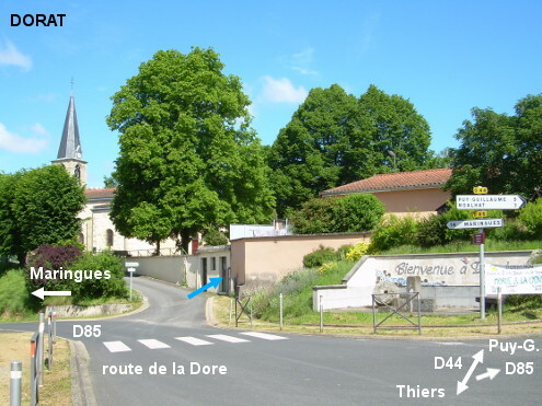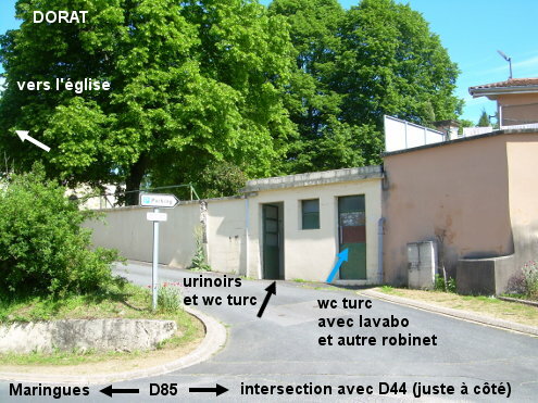 Les toilettes se trouvent dans le mur au début de l'allée qui mène à l'église, et sont situées à 25 mètres de l'intersection D85 / D44. Sur la D44 en provenance de Thiers, à l'intersection avec la D85, tourner à gauche dans la D85 en direction de Maringues puis prendre aussitôt l'allée à droite qui monte vers l'église (flèche ''parking''). Les portes des toilettes sont situées dans le mur de soutènement côté droit. N.B. : La porte de droite donne dans une cabine WC turc avec un lavabo sur la gauche et un robinet supplémentaire fixé sur le mur à droite du WC turc (la porte de gauche est celle de la partie avec les urinoirs et une autre cabine WC turc mais sans robinet).