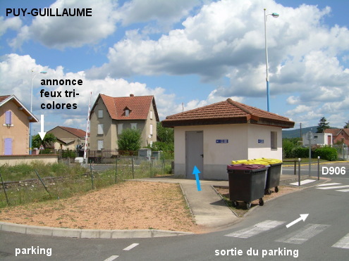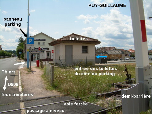Ces toilettes se trouvent au bord du parking aire de covoiturage situé à côté du passage à niveau de la voie ferrée sur la D906 direction Thiers, à 200 mètres du carrefour avec les D44, D63 et D114. Sur la D44 en provenance de Dorat, suivre la direction du centre-ville puis aux feux tricolores à l'intersection de la D906 avec la D63 venant à gauche de Limons et la D114 partant en face en direction de Saint-Victor-Montvianex, tourner à droite dans la D906 (à très grande circulation) en direction de Thiers. Juste après le passage à niveau, entrer sur le parking à droite : le petit bâtiment des toilettes est juste là sur la droite à côté du passage à niveau et sa porte d'entrée est située sur la face opposée à la D906.