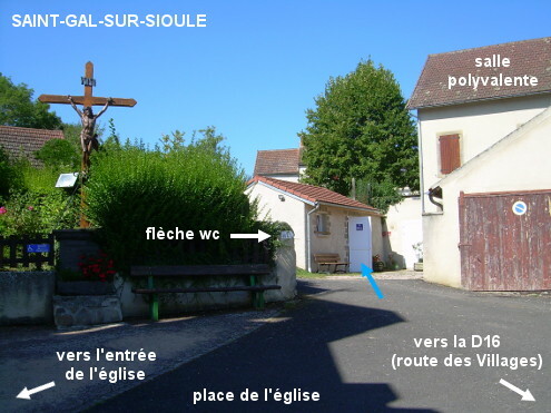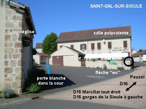 Les toilettes (fléchées) se trouvent dans une cour derrière la salle polyvalente, près de l'église et de la Mairie, toutes sises au bord de la D16 direction Pouzol. En provenance des gorges de la Sioule (D915) sur la D16, au carrefour en T la D15 démarre à gauche en direction de Marcillat, tandis que la D16 continue sur la droite (route des Villages). Tourner à droite et 120 mètres après, au niveau de la Mairie sise côté droit, entrer à gauche sur la place entre l'église et la salle polyvalente. Se diriger vers le fond et vers la droite (en suivant les deux flèches ''WC'') pour accéder à la cour (20 mètres asphaltés puis 10 mètres gravillonnés) dans laquelle on trouvera la porte des toilettes sur la gauche. N.B. : Les deux lavabos (dans l'entrée et dans la cabine WC de gauche) sont trop petits pour pouvoir remplir un bidon directement.