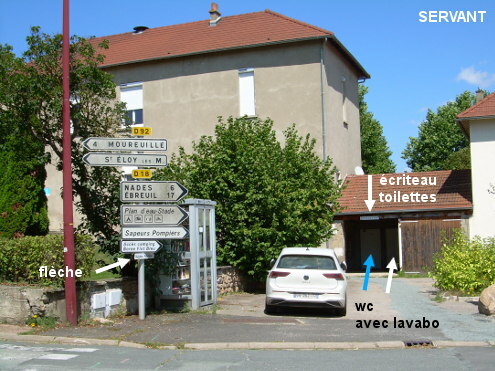Les toilettes (fléchées) se trouvent dans un bâtiment très en retrait à côté du carrefour D92 / D18. En provenance de Menat sur la D18 (juste après la sortie de ce village-ci, il faudra emprunter 680 mètres de D2144 à très grande circulation en faisant gauche / droite pour récupérer la suite de la D18), au carrefour en T avec à gauche la D92 direction Moureuille et à droite la suite de la D18, une petite flèche en bas du poteau de signalisation D92 / D18 pointe vers les toilettes dans le bâtiment bas en face de la route d'où l'on vient et coincé entre deux autres bâtiments hauts. Il y a un écriteau ''toilettes'' au fronton dudit bâtiment, celles-ci sont en retrait derrière la partie ouverte abritée située à l'avant. N.B. : Les deux portes ont la même petite pancarte avec le pictogramme WC hommes et femmes, mais à droite ce sont des urinoirs et le lavabo est trop petit. Par contre derrière la porte de gauche il y a une grande cabine WC avec un lavabo dans lequel on peut remplir facilement ses bidons.