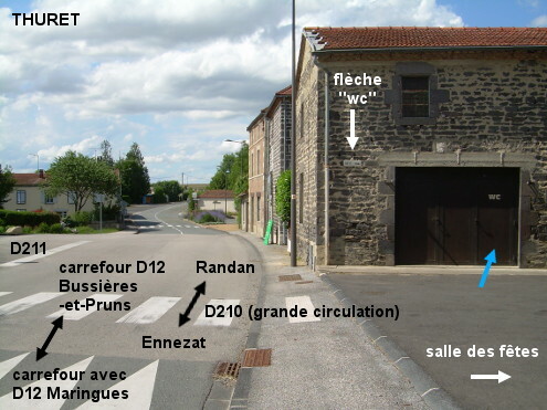 Les toilettes sont situées à gauche de la salle des fêtes, à proximité immédiate du carrefour D210 / D211. Sur la D12 en provenance de Maringues, au carrefour avec la D210 (route à très grande circulation) tourner à droite en direction de Randan. Après avoir passé l'église côté gauche et juste avant le carrefour à gauche avec la D211 direction Sardon, en face du passage piéton entrer à droite sur le petit parking de la salle des fêtes. La porte des toilettes nous fait face, dans un bâtiment au bord de la route et sur la gauche du parking. P.S. : La suite de la D12 (direction Bussières-et-Pruns) se trouve à gauche à la sortie du village.