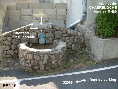 Ces toilettes et ce robinet se trouvent de part et d'autre d'un parking situé au bord de la D2089, non loin du carrefour avec la D324 et avec la D86 direction Arconsat. 1) En provenance d'Arconsat sur la D86, au carrefours situés l'un à côté de l'autre avec la D324 puis la D2089, à chacun des deux stops tourner à droite pour être dans la D2089 direction Thiers. Quelques mètres après, entrer à droite sur le parking au début duquel il y a un panneau fléché avec le pictogramme indiquant la présence des toilettes. Celles-ci sont situées au milieu du bord droit du parking, il s'agit de vieilles toilettes de type vespasienne sans robinet. Mais de l'autre côté du parking, au milieu de son bord gauche, il y a un robinet au-dessus d'un bassin rond en pierre, accompagné d'un écriteau ''eau potable''. 2) En provenance de Viscomtat sur la D322 puis la D86 (en passant par le col des Sagnes), au carrefour en T avec la D2089 tourner à gauche en direction de la ville dans cette route à très grande circulation mais dont on n'aura que 360 mètres hors zone urbaine. Plus loin, peu après le carrefour à droite avec la D324 venant du col de Saint-Thomas, entrer à droite sur le parking comme au point 1.