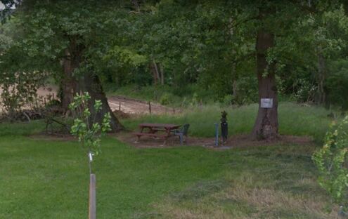 Accès sur le chemin de St Jacques de Compostelle au niveau de ferme, sous les arbres à coté de la table de pique-nique
