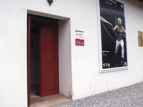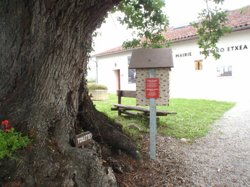 Toilettes publiques de la Mairie de Camou, en face de l’église, au bord de la D29, avec parc ombragé et tables devant la Mairie. Situées sur le parcours de la Véloroute La Scandibérique (EV3)