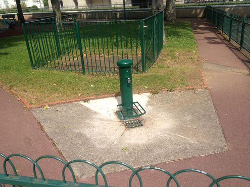 La borne se troue dans un parc pour enfants, dans le parc de la mairie, au bout du parking.