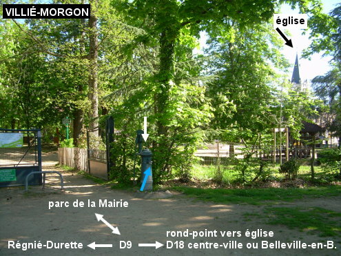 Il s'agit d'un robinet monté sur une ancienne borne pompe à eau verte. Celle-ci se trouve juste à côté de l'entrée d'un grand parc arboré avec aires de jeux implanté au bord de la D9 direction Régnié-Durette, à 150 mètres du rond-point avec la D18. 1) En provenance de Régnié-Durette sur la D9, dans une grande ligne droite en faux-plat descendant, on apercevra côté gauche un grand parc arboré longé par des emplacements de stationnement tout en longueur. L'entrée de ce parc (celui de la Mairie qui est du côté opposé et que l'on ne voit pas) est située au niveau d'un passage piéton qui est sur un dos d'âne et presque en face d'une rue adjacente à droite. La borne est à droite du portail d'entrée du parc, côté extérieur. 2) Sur la D18 en provenance d'Avenas, après qu'elle a été rejointe à gauche par la D86 venant de Chiroubles, au carrefour à droite avec la direction de Régnié-Durette (cette rue rejoint la D9 par un raccourci), deux options sont alors possibles. 2a) Tourner à droite puis quand on arrive sur la D9 tourner à gauche pour trouver quelques mètres plus loin côté gauche l'entrée du parc et la borne. 2b) Ou continuer tout droit sur la D18 pour traverser le centre-ville. Celle-ci est ensuite rejointe à gauche par la D68 venant de Fleurie, et arrive plus loin au rond-point D18 / D9 à côté de l'église (où la D18 continue en direction de Belleville-en-Beaujolais). Tourner à droite dans la D9 et 150 mètres plus loin, s'arrêter à droite pour trouver la borne devant le parc. 3) En provenance de Corcelles-en-Beaujolais sur la D9, celle-ci rejoint la D18 venant à gauche de Belleville-en-Beaujolais juste avant un rond-point à côté de l'église où ces deux routes se séparent. Tourner à gauche dans la D9 (direction Régnié-Durette et Beaujeu) et 150 mètres plus loin, après le virage, s'arrêter à droite pour trouver la borne devant le parc arboré.