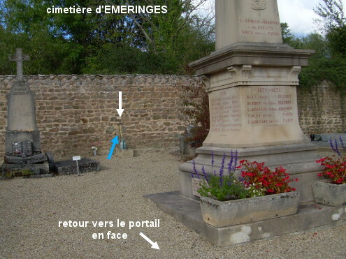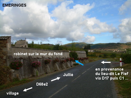 Le cimetière (fléché) est situé en dehors du village, il est implanté côté gauche 250 mètres après le panneau de fin de village sur la D68e2 en direction de Jullié. Le robinet est à l'intérieur du cimetière, fixé sur le mur du fond en face du portail, derrière une obélisque érigée à l'intérieur (15 mètres d'allée dallée puis 20 mètres gravillonnés). 2) En provenance de Juliénas sur la D17, au lieu-dit Le Fief, au carrefour avec la D26 et la D68 direction Chénas, ne pas suivre la direction d'Emeringes par la D26 mais prendre un raccourci en tournant à droite dans la suite de la D17 (direction Jullié) puis peu après tourner à gauche en direction d'Emeringes en passant sur le petit pont (route de la Vavre, C1). Plus loin, si l'on est attentif, on verra la flèche indiquant le cimetière à droite et on arrivera 200 mètres après face au portail du cimetière, perpendiculairement à la D68e2. Sinon, on arrivera sur la D68e2 au niveau du panneau de début de village, et il faudra donc tourner à droite en direction du cimetière.