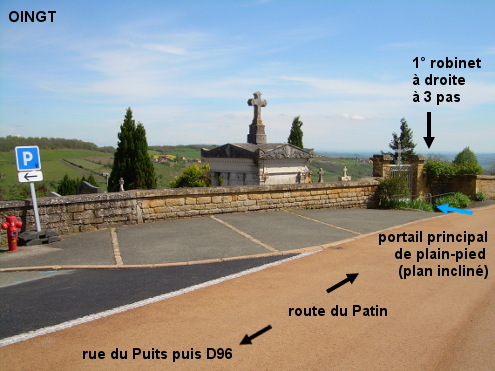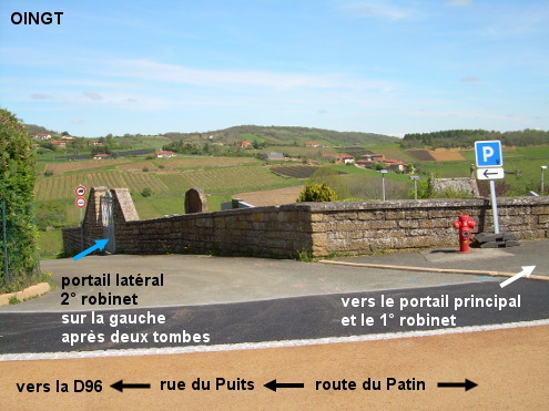 Le cimetière (fléché) est implanté dans une rue secondaire à 530 mètres de la D96. En provenance du lieu-dit Le Saule-d'Oingt sur la D120, au carrefour en T avec la D96 qui arrive de la gauche en provenance de Theizé (et part à droite en direction de Saint-Laurent-d'Oingt plus loin à droite ou de la suite de la D120 en direction du Bois-d'Oingt tout droit), faire gauche / droite pour prendre la rue du Puits presque en face et en direction du cimetière. Rouler alors tout droit jusqu'au cimetière implanté côté gauche. On verra d'abord le portail latéral donnant sur la rue adjacente à gauche, mais le robinet qui est à l'intérieur à sa gauche à 10 mètres et après deux sépultures est moins accessible que l'autre robinet. Continuer tout droit jusqu'au portail principal, entrer et faire trois pas sur la droite pour trouver cet autre robinet.