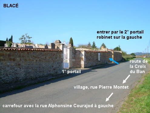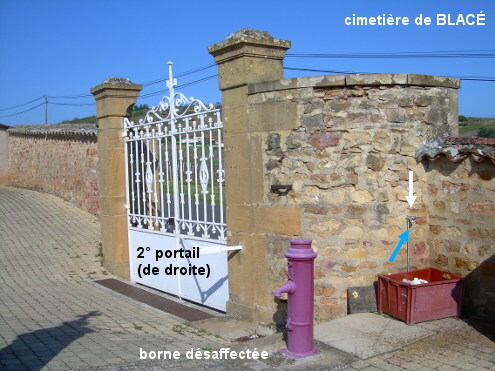 Le cimetière est implanté dans une rue secondaire juste après la fin du village, à 430 mètres du rond-point D19 / D19a. Le robinet est à l'intérieur du cimetière à gauche du portail de droite. En provenance de Salles-Arbuissonnas sur la D19, au rond-point avec la D19a prendre la première sortie puis tourner dans la première à droite (rue Adolphe Valette, au début de laquelle il y a un plan du village). Monter jusqu'au carrefour en T et tourner à gauche (rue Alphonsine Courajod) puis tourner à droite : on voit déjà le cimetière, celui-ci est implanté côté gauche un peu plus loin juste après le panneau de fin de village. Continuer jusqu'au deuxième portail, entrer et faire six pas sur la gauche pour trouver le robinet contre le mur (derrière une ancienne borne désaffectée). N.B. : Après le rond-point, on aurait pu prendre la deuxième à droite (rue Pierre Montet) et monter tout droit jusqu'au cimetière, mais on n'aurait pas pu refaire cet itinéraire en sens inverse pour repartir à cause du tronçon en sens unique de la rue Dupasquier situé entre la rue A. Valette et la rue P. Montet.