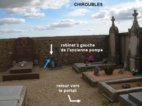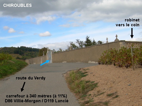Le cimetière (fléché) est situé sur les hauteurs du village, sur la route menant au lieu-dit Le Verdy. En provenance de Villié-Morgon sur la D86, à l'endroit où elle oblique à gauche, tandis qu'à droite la D119 passe à côté de l'église et mène à Lancié, prendre la petite route en face qui monte au cimetière (pente d'environ 11%). Le cimetière est implanté côté droit 340 mètres plus loin. Entrer et se diriger vers le coin avant droit pour trouver le robinet (25 mètres d'allée gravillonnée).