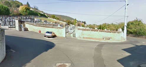 Quand vous passez devant l'église, passez sur le pont pour traverser la voie de train, prenez la 1ère rue à droite et vous arriverrez face au cimetère.