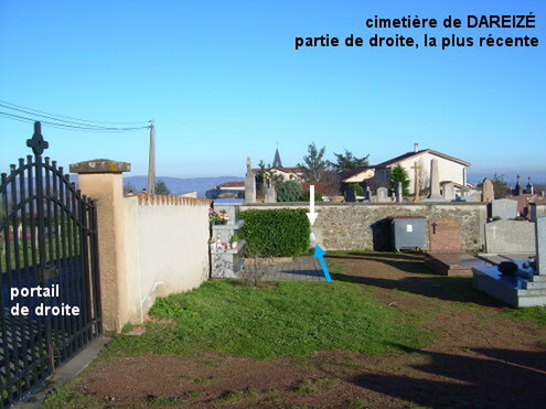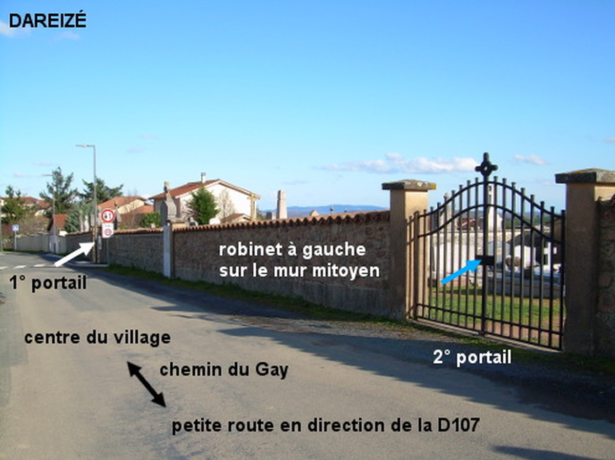 Le cimetière est implanté à la sortie du village sur une petite route qui rejoint la D107 au nord et au-dessus de Tarare. Le robinet se trouve à l'intérieur du cimetière dans la partie de droite et sur le mur mitoyen. 1) Sur la D31 en provenance de Saint-Vérand, tourner à droite après un abribus et le deuxième passage piéton en suivant la petite flèche ''cimetière'' et aussitôt à gauche au carrefour en T. Le cimetière est implanté côté gauche plus loin et en face d'une aire de jeux. Ignorer le premier portail (qui donne dans la partie plus ancienne), continuer jusqu'au deuxième portail (à 170 mètres de la D31) et entrer. Se diriger vers le coin avant gauche de cette partie (aux allées en terre battue) pour trouver le robinet sur le mur mitoyen (à environ 15 mètres du portail). P.S.1 : En continuant dans le chemin du Gay (plus loin prendre la branche droite d'un Y puis à droite au premier carrefour en T) et après trois montées successives dont une très pentue on débouchera sur la D107 (la direction de Tarare est sur la gauche). 2) En provenance de Saint-Clément-sur-Valsonne ou de Tarare sur la D107, surveiller respectivement le côté gauche ou le côté droit de la route pour repérer l'une des deux flèches ''Dareizé'' au début de la petite route menant à ce village. Rouler alors tout droit, vers les maisons prendre la branche gauche du carrefour en Y, puis ans avoir vu de panneau de début de village on verra le cimetière implanté côté droit. P.S.2 : En tournant ensuite dans la première à droite (qui passe à côté de la Mairie), on rejoindra la D31.