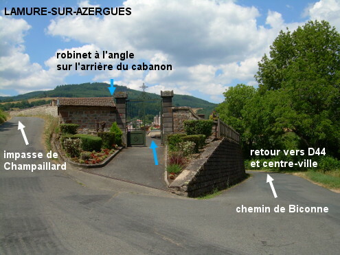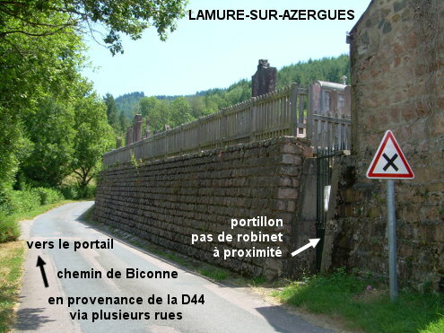 Le cimetière est situé sur les hauteurs de la ville, à 500 mètres de la D44. En provenance de Claveisolles sur la D23 puis la D9 et enfin la D385 (800 mètres hors zone urbaine de cette route à très grande circulation), en centre-ville tourner à gauche dans la D44 en direction du col de la Croix-Montmain. Peu après et devant le Monument aux Morts, tourner à droite dans la D485E pour la quitter peu après en prenant la branche gauche du carrefour en Y : franchir le passage à niveau et monter vers l'église, la contourner par la droite. Continuer à monter tout droit (pente moyenne 6%) jusqu'au cimetière implanté côté droit, dans l'angle avec une rue adjacente à droite en Y inversé (impasse de Champaillard). Son portail est situé dans la fourche dudit carrefour, et orienté face au sens opposé de circulation. Le robinet est à l'intérieur du cimetière, sur l'arrière et à l'angle du cabanon construit dans le coin gauche et qui jouxte le portail. N.B. : Il n'y a pas de robinet près du portillon que l'on voit au début du mur du cimetière quand on arrive vers celui-ci.