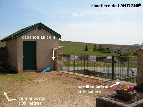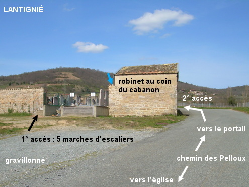 Le cimetière est situé dans une rue secondaire, à 760 mètres de la D78. En provenance de Régnié-Durette sur la D135 puis la D78, tourner à droite en direction du centre du village, puis continuer tout droit dans la rue des écoles en laissant la suite de la rue de l'église qui part à droite. Au carrefour où il y a une Madone, attention : la position du premier panneau de droite avec les petites flèches de signalisation locale dont celle du cimetière, prête à confusion. Ce n'est en effet pas ici qu'il faut tourner à gauche, il faut continuer tout droit et seulement au carrefour plus loin, en Y, prendre la branche gauche qui monte vers le cimetière implanté plus loin côté gauche. Le robinet est à l'intérieur du cimetière à côté du cabanon dans le premier coin, et il y a deux façons d'y parvenir. 1a) Entrer par le portillon sur le mur latéral qui nous fait face quand on arrive, il faut donc d'abord monter cinq marches d'escaliers, puis faire quelques pas sur la droite jusqu'au robinet. 1b) Ou bien continuer jusqu'au portail côté route, entrer de plain-pied et parcourir 35 mètres d'allée gravillonnée vers la gauche pour arriver vers le robinet qui est à droite du cabanon qui est implanté dans le coin.