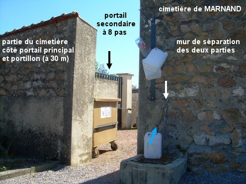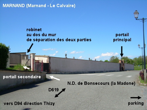 Le cimetière est situé sur les hauteurs dans le secteur ''Marnand - le Calvaire'' de ce village inclus dans la communauté de communes ayant pris pour nom Thizy-les-Bourgs (regroupant Thizy, Bourg-de-Thizy, Mardore, Marnand, La Chapelle-de-Mardore). En provenance de Thizy sur la D9 puis la D94, environ 1,16 km après le carrefour D9 / D94, sur la D94 en direction du village, ignorer alors ''Marnand - bourg '' pour prendre la branche gauche du carrefour en Y (pré-signalé) en direction de ''Marnand - le Calvaire'' (sur la D619 d'après la borne du point kilométrique 0) pour entrer dans ce quartier. Monter pendant 410 mètres (pente à 7%) et continuer 200 mètres sur le replat pour arriver au cimetière implanté côté gauche. Entrer par le premier portail et faire huit pas vers la droite pour trouver le robinet au dos du mur de séparation des deux parties du cimetière, à gauche du passage. Si l'on entre par le portillon à côté du portail principal (au n°20) situé au milieu du mur avant du cimetière, il faudra parcourir 30 mètres vers la gauche pour trouver le robinet sur le mur de séparation. N.B.1 : Si on continue tout droit, la D619 finit par déboucher sur la D56 près de La Chapelle-de-Mardore (visible en face). N.B.2 : Si à la fin du cimetière on prend à droite la rue des Lavandières, elle descend dans le centre du bourg vers l'église d'où l'on peut continuer sur la D94 (à gauche en direction du col de Burdel).