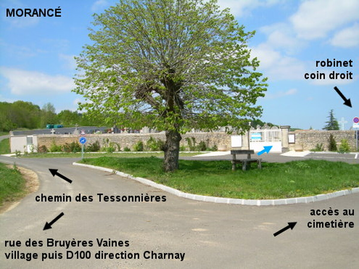 Le cimetière est situé sur les hauteurs en dehors du village sur une route secondaire, à 680 mètres de la D100 direction Charnay. 1) En venant de Lucenay sur la D30, aux deuxièmes feux, à proximité de l'église et à l'intersection avec la D100, tourner à droite en direction de Charnay. Peu après et juste après la rue perpendiculaire à droite, quitter la D100 qui vire à gauche pour continuer sur la branche droite dans la rue des Bruyères Vaines. Cette rue comporte une portion de 400 mètres qui monte avec une pente de 7,5% (et un maximum proche de 12%) avant de s'aplanir. Au carrefour en Y juste après le panneau de fin de village tourner à droite en direction du cimetière, puis un peu plus loin (sur le replat) prendre à droite l'allée en arc de cercle qui dessert le cimetière. Entrer par le portail et se diriger vers le coin à droite pour trouver le robinet au tout début du mur latéral droit (à 20 mètres du portail, sur une allée en gravillons cimentés). 2) En provenance de Charnay sur la D100, au carrefour peu avant l'église tourner dans la première à gauche (rue des Bruyères Vaines) puis monter jusqu'au cimetière comme au point 1.