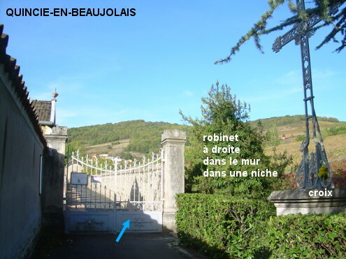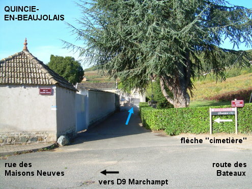 Le cimetière (fléché) est caché au bout d'une allée située à la jonction de rues secondaires. Le robinet est à l'intérieur du cimetière, dans une niche dans le mur immédiatement à droite du portail. 1) Sur la D9 en provenance de Régnié-Durette, longtemps après le début du village, à un endroit où la route vire à gauche, continuer tout droit en direction du cimetière (rue de la Forge, en montée). Au carrefour en T qui est 100 mètres plus loin, tourner à droite puis à gauche (flèches) pour entrer dans l'allée asphaltée perpendiculaire de 40 mètres, coincée entre le mur d'une propriété et une haie arbustive, qui dessert le cimetière. 2) Dans l'autre sens sur la D9 (en venant de Marchampt), vers le centre du village, au carrefour en Y dans la fourche duquel il y a un square et où on aperçoit l'église un peu plus loin sur la gauche, quitter la D9 pour prendre la rue à gauche (rue des Maisons Neuves). Continuer tout droit jusqu'au ''cédez-le-passage'' (au carrefour avec la rue de la Forge à droite) et 40 mètres après entrer à gauche dans l'allée qui dessert le cimetière.