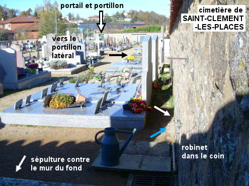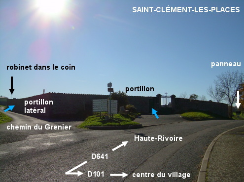 Le cimetière est implanté côté gauche à la sortie du village sur la D641. Le robinet est à l'intérieur du cimetière dans le coin arrière gauche, à presque 60 mètres du portillon jouxtant le portail. 1) En provenance de Chambost-Longessaigne (via un petit bout de D7 direction Longessaigne) sur la D101, juste après le centre du village (avec son église) tourner à droite dans la D641 (direction Haute-Rivoire). Plus loin, la D641 vire à droite en passant devant le cimetière tandis que presque en face sur la gauche le chemin du Grenier dessert son portillon latéral. 1a) On peut entrer par ce portillon (il y a deux marches d'escaliers à l'intérieur) puis parcourir 10 mètres sur la gauche jusqu'au coin pour trouver le robinet. 1b) Ou on peut virer sur la D641 puis prendre à gauche l'allée asphaltée de 20 mètres qui dessert le portail et le portillon qui le jouxte, et entrer par ce portillon-ci. Ensuite aller à gauche jusqu'au coin puis prendre l'allée qui longe les sépultures contre le mur de gauche jusqu'au coin arrière pour trouver le robinet (allées en terre battue). 2) En provenance de Saint-Laurent-de-Chamousset sur la D4 puis la D101, peu après le panneau de début de village et derrière l'ancienne bascule tourner à gauche dans la D641 (on ne voit pas la flèche) puis idem point 1. 3) En provenance de Haute-Rivoire, sur la D81 puis 520 mètres de D489 (à très grande circulation) direction Feurs, et enfin sur la D641, environ 50 mètres après le panneau de début de village, tourner à droite en épingle pour prendre l'allée qui dessert le cimetière ou prendre juste après le chemin du Grenier à droite si on préfère entrer par le portillon latéral plus proche du robinet.