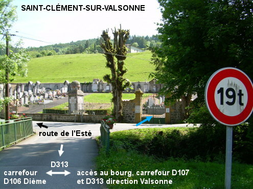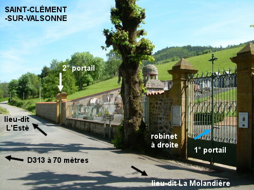 Le cimetière est situé en dehors du bourg, à 70 mètres de la D313, au bord des petites routes menant aux lieux-dits la Molandière ou l'Esté. Le robinet est à l'intérieur du cimetière, à droite du portail de droite. 1) En provenance du col de la Croix-Paquet sur la D56E puis la D107, au carrefour avec la D313 à grande circulation, on peut prendre la rue en face pour entrer dans le village et traverser tout le village sur des rues parallèles à la D313 et éviter ainsi un long tronçon de celle-ci. Ensuite, au débouché sur la D313, tourner à gauche puis 170 mètres plus loin tourner à droite en direction des lieux-dits. Franchir le petit pont sur la rivière, on est alors au carrefour en T devant le cimetière qui a deux portails. Entrer par le portail de droite (son loquet se soulève malaisément) pour trouver le robinet à l'intérieur à quatre pas sur la droite après l'ancienne borne Bayard. 2) En provenance de Dième sur la D106 puis la D313 (2,4 km de cette route à grande circulation, mais avec bandes cyclables sur les côtés de la première moitié), après le panneau annonçant un passage piéton tourner à gauche avant un grand bâtiment industriel blanc avec des piliers verts et un toit gris foncé et avant la rue à droite qui dessert le village. On arrivera face au cimetière comme en fin du point 1.
