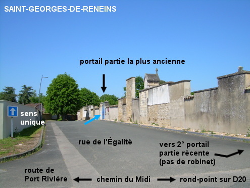 Le cimetière est implanté dans une rue secondaire. Le robinet est à l'intérieur du cimetière à droite du portail de la partie la plus ancienne (portail à barreaux sis rue de l'Égalité). 1) En provenance du lieu-dit Blaceret sur la D20, au rond-point avec la D306, prendre la première sortie (D306 direction Villefranche-sur-Saône) pour accéder un peu plus loin à la suite de la D20 en direction de Montmerle-sur-Saône : aux feux tourner à gauche (se positionner sur la file de pré-sélection). Juste après, quitter la D20 qui vire à gauche, continuer tout droit (route de Port Rivière), plus loin et après le virage en S qui est juste après une rue en sens interdit en face à gauche (c'est le débouché de la rue de l'Égalité), tourner dans la première à gauche (chemin du Midi) en direction du cimetière. Ensuite tourner à gauche dans la rue de l'Égalité en sens unique pour arriver à côté du portail de l'ancienne partie du cimetière qui est implanté côté droit à l'angle des deux rues. 2) En provenance de Montmerle-sur-Saône sur la D20, au deuxième rond-point tourner à gauche en prenant la deuxième sortie (chemin du Midi). Rouler tout droit jusqu'au cimetière implanté côté droit dans l'angle de deux rues adjacentes. Ignorer le premier portail que l'on voit (portail plein qui donne dans la partie la plus récente, sans robinet) et continuer jusqu'au coin pour tourner à droite et parvenir au portail de la partie la plus ancienne (à 410 mètres du rond-point sur la D20). N.B. : Les horaires d'ouverture sont de 8h30 à 19h30 en été (du 15 avril au 15 octobre 2025).