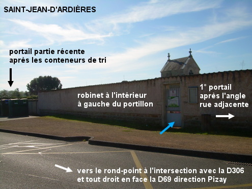 Le cimetière est situé dans une rue secondaire à 150 mètres du rond-point D306 / D69. Le robinet est à l'intérieur du cimetière, gauche du portillon sis route Sainte-Geneviève. 1) Sur la D69 en provenance du lieu-dit Pizay, après le carrefour à gauche avec la D119E venant de Corcelles-en-Beaujolais, au rond-point avec la D306 continuer tout droit (pas de fléchage). Le cimetière est implanté peu après côté droit derrière une rue adjacente. Ignorer le portail situé dans cette impasse de l'Écluse, continuer quelques mètres tout droit jusqu'au portillon au milieu du mur d'enceinte pour trouver le robinet à l'intérieur à gauche de ce portillon. 2) Sur la Voie Verte D1VV en provenance de Beaujeu et Cercié, quand on arrive à côté du rond-point D337 / D306 tourner à gauche dans la D306 (route à très grande circulation) en prenant la bande cyclable sur le trottoir de gauche. Continuer tout droit jusqu'au rond-point avec la D69 (à gauche) et tourner à droite dans la route Sainte-Geneviève pour arriver à côté du portillon du cimetière 150 mètres après.