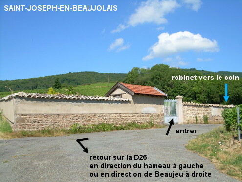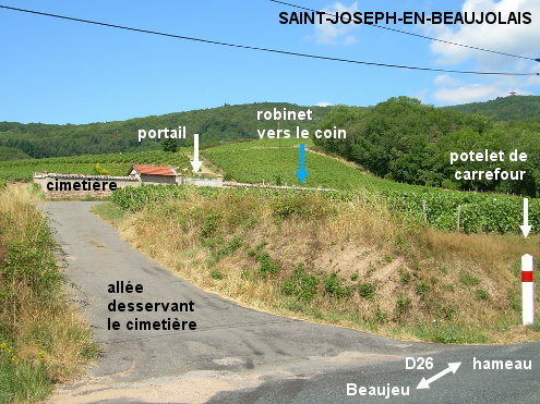 Le cimetière de ce hameau rattaché à la commune de Villié-Morgon, est situé en dehors de celui-ci, près de la D26 direction Beaujeu. Il est desservi par une courte allée et on peut le voir depuis la route. Le robinet est à l'intérieur du cimetière près du coin avant droit. 1) En provenance de Beaujeu sur la D26 en direction du col du Truges, et de Juliénas, sur le replat après le lieu-dit Les Châtillons, alors que l'on aperçoit côté droit au-dessus des arbres les deux clochers pointus de l'église, repérer côté gauche les deux potelets blancs à bande rouge encadrant le carrefour pour prendre cette allée qui monte vers le cimetière (son portail est à 70 mètres de la D26). Entrer et parcourir 10 mètres sur la droite dans l'allée en herbe jusqu'au robinet qui se trouve après le bac à déchets végétaux et presque dans le coin. 2) En descendant du col du Truges sur la D26 en direction de Beaujeu, traverser tout le hameau et 200 mètres après le panneau de fin de village (et peu après le point kilométrique 6 sur la D26), prendre à droite l'allée qui monte vers le cimetière.