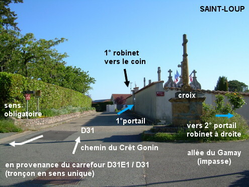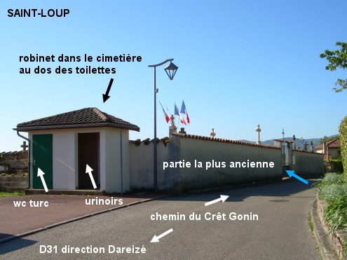 Le cimetière (fléché) est situé dans une rue secondaire à 110 mètres de la D31. Il comporte deux parties avec chacune un robinet. Il y a aussi des toilettes (sans robinet) accolées au cimetière. 1) En provenance de Dareizé sur la D31, après la rue adjacente à droite (à côté de la Mairie) qui dessert le bourg, tourner dans la troisième à droite en direction du cimetière. Celui-ci est implanté côté gauche 110 mètres plus loin, juste après un petit parking au bord duquel il y a des toilettes contre le mur du cimetière. Le premier portail donne dans la partie la plus ancienne et on y trouvera le premier robinet dans le coin avant gauche (au dos des toilettes) à 15 mètres du portail (allée en terre battue). Si on continue dans la rue et que l'on tourne derrière le cimetière, on arrivera ensuite vers le deuxième portail qui donne dans la partie la plus récente. Le deuxième robinet est à l'intérieur du cimetière à droite de ce portail (à quatre pas). 2) En provenance de Pontcharra-sur-Turdine sur la D31E1, à l'intersection avec la D31 (point km 0 de la D31E1), prendre la rue en face (chemin du Crêt Gonin) et monter vers le cimetière qui est implanté sur un replat côté droit derrière le carrefour (il y a une croix) avec une rue adjacente en impasse. Là on peut soit aller à droite vers le portail de la partie récente (à 50 mètres) parce que son robinet est juste à côté, soit continuer tout droit jusqu'au portail de la partie ancienne (à 240 mètres du carrefour D31E1 / D31) puis entrer et parcourir les 15 mètres jusqu'au robinet dans le coin gauche.