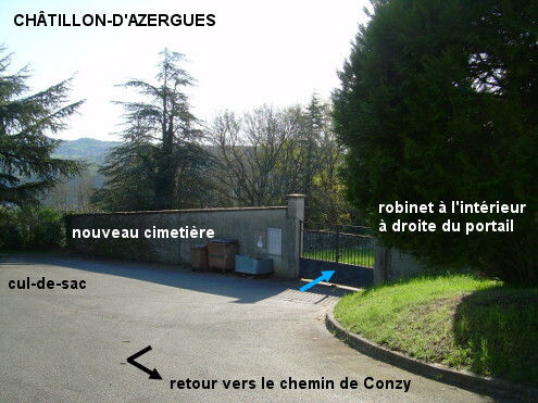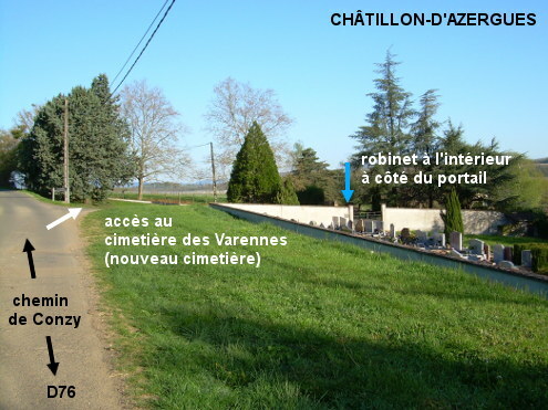 Le nouveau cimetière, dit « cimetière des Varennes » (fléché), est situé dans une rue adjacente (au début de laquelle il y a une Madone) à 1 km de la D76 direction L'Arbresle. Sur la D76 en provenance d'Alix, après le centre du village et la traversée aux feux de la D385, après le pont sur la rivière l'Azergues, tourner dans la deuxième à droite au début de laquelle il y a une Madone en suivant la flèche ''cimetière des Varennes'' (parmi plusieurs flèches) et monter (sur les deux cent premiers mètres la pente est d'environ 7,7%). On passera d'abord à côté de l'ancien cimetière (début avril 2025 l'eau était encore coupée dans celui-ci tandis qu'elle était déjà remise en service dans le nouveau cimetière). Puis 740 mètres après celui-ci, prendre l'allée à droite qui descend en virant à droite vers le nouveau cimetière (son portail est à 70 mètres du chemin de Conzy). Le robinet est à l'intérieur du cimetière à droite du portail, il est surmonté d'un écriteau jaune « eau non contrôlée ». N.B. : Il y avait une fuite (en avril 2025) au niveau du raccord entre le robinet et le morceau de tuyau d'arrosage avec pour résultat que l'on risque de se faire éclabousser. P.S. : En repartant on peut continuer jusqu'au lieu-dit Conzy et là tourner à droite dans la rue des Vendangeurs puis plus loin au rond-point prendre la première sortie pour entrer dans Chessy-les-Mines (et arriver ensuite à l'intersection avec la D385 face à la D19 direction Frontenas).