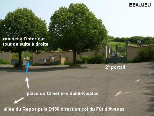 Le ''cimetière Saint-Nicolas'' (fléché) est situé à la périphérie nord-ouest de la ville au bout d'une courte rue en impasse, à 110 mètres de la D136, en direction d'Avenas. 1) En provenance de Cercié sur la Voie Verte D1VV dite ''du Beaujolais'', à la fin de celle-ci tourner à droite en direction du centre-ville dans la D37 qui traverse la ville tout en longueur. Rouler donc tout droit pendant un long moment et au-delà de l'église érigée côté gauche. Plus loin, tourner à droite (flèche ''cimetière Saint-Nicolas'') dans la D136 en direction du col du Fût-d'Avenas. Au stop à la fin du tronçon en sens unique, tourner à droite en direction du cimetière (petite flèche parmi une série de flèches). Monter jusqu'au cimetière implanté en face au bout de l'allée. Entrer par le portail de gauche pour trouver le robinet immédiatement à droite. 2) En descendant du col du Fût-d'Avenas sur la D136, lorsqu'on arrive au stop face au sens interdit, tourner à gauche (la flèche du cimetière est orientée pour ceux qui arrivent d'en face) et monter jusqu'au cimetière. P.S. : La rue du Pont des Pénitents à droite débouche sur la D37 qui traverse toute la ville à gauche (ou rejoint la D337 au lieu-dit Les Dépôts sur la droite).