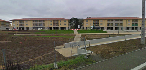 La fontaine est située au coeur d'une zone de jeux pour enfants, sur une pelouse devant de petits immeubles.