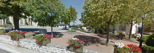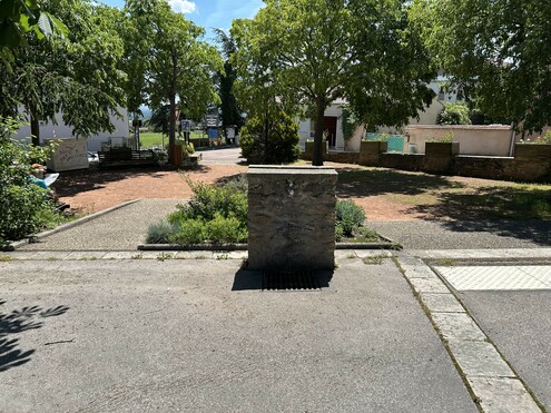 Sur la place du village, entre la mairie et l'église, la fontaine a la forme d'un petit mur en pierres.