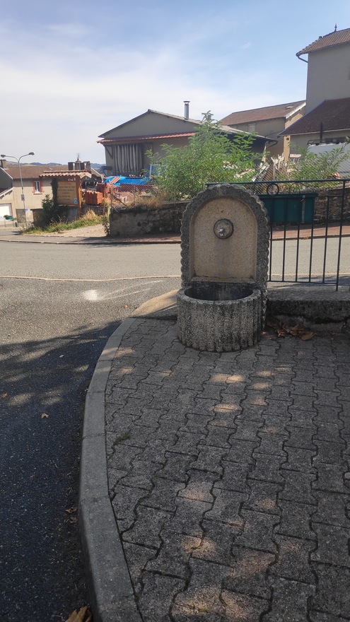 Le robinet est à gauche, à l'entrée du parking de la Place des Platanes. C'est dans le village de Grandris, au début de la montée vers Meaux-la-Montagne par la D617