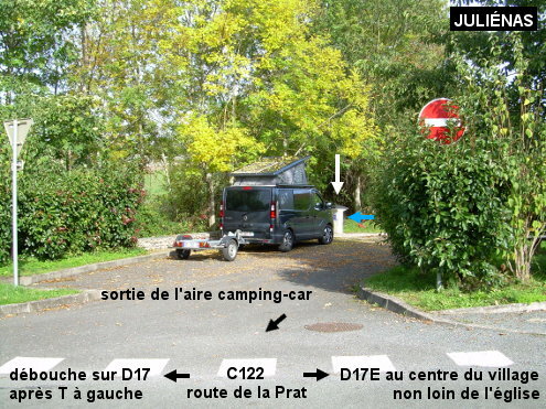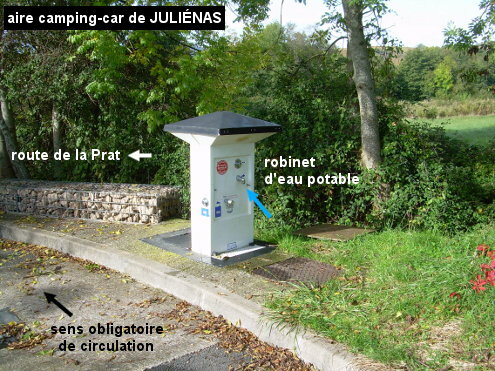 L'aire pour camping-car (fléchée) est implantée à 280 mètres de la D17E qui traverse le centre du village, dans une rue secondaire qui débute non loin de l'église. Sur la borne blanche pour camping-car, le robinet d'eau potable (identifié par un pictogramme ad-hoc) est celui qui est en haut et à droite. 1) En provenance de La Chapelle-de-Guinchay sur la D95 qui devient D17, puis sur la D17E, peu après l'église érigée côté droit prendre la branche gauche du carrefour en Y en suivant la flèche de l'aire pour camping-car. Ensuite, après une rue adjacente à droite (rue de la Rabelette), après un long parking implanté côté droit, tourner à droite sur la bretelle en sens unique qui dessert l'aire pour camping-car et aller presque jusqu'au bout pour trouver la borne pour camping-car côté droit peu avant la sortie. P.S. : En repartant, on peut continuer sur cette route, tourner à gauche au carrefour en T pour déboucher ensuite sur la D17 (en direction du lieu-dit Le Fief sur la droite). 2) En provenance du lieu-dit Le Plâtre-Durand sur la D486ter puis la D169 qui devient D17E, au rond-point prendre en face la rue de la Rabelette (en sens unique) entre la D137 (venant de Cenves après la D23) et la suite de la D17E, elle débouche en T sur la route de la Prat. L'aire pour camping-car est un peu plus loin sur la droite.