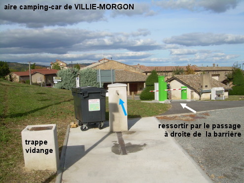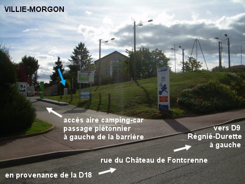 L'aire pour camping-car est située dans une rue secondaire, non loin de la Mairie et de la salle des fêtes. 1) Sur la D18 en provenance d'Avenas, après qu'elle a été rejointe à gauche par la D86 venant de Chiroubles, après le carrefour à droite avec la direction de Régnié-Durette et de la D9, peu après qu'elle a été rejointe à gauche par la D68 venant de Fleurie, au sortir d'une courbe à droite, tourner à droite dans la rue étroite dont le début est en sens unique. Continuer presque jusqu'à la fin de la rue (il y a la salle des fêtes à droite) et entrer à gauche sur l'aire pour camping-car. On peut ensuite passer par le cheminement piéton à gauche de la barrière qui se soulève pour le passage des véhicules. On trouvera la borne carrée en ciment côté droit peu après. Le robinet fileté (celui qui délivre avec certitude de l'eau potable) est situé sur le côté opposé à la rue. 2) On peut aussi prendre un raccourci en tournant à droite en direction de Régnié-Durette et de la D9, dans ce cas tourner ensuite dans la première à gauche puis aussitôt à droite sur l'aire camping-car.